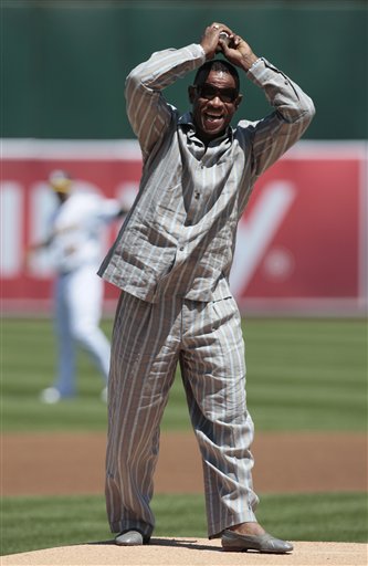 Here’s Rickey throwing out the first pitch before an A’s game in 2011, wearing… something: