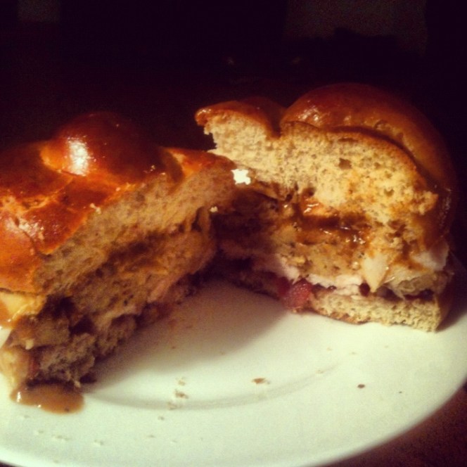 It was delicious, but I failed to follow my own advice and put on a bit too much stuffing, so it was pretty bready. Also, it was late and I’m lazy, so I didn’t bother heating up the turducken or the gravy or toasting the roll.