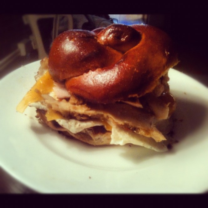 Damn right I did. TIP: To make any sandwich appropriate for breakfast, add a fried egg. I actually added two. That’s more whole-wheat challah doing the sandwiching, and there’s more jalapeno-cranberry chutney on the bottom. I skipped the gravy this time because c’mon, man, it’s breakfast. But I added a slice of cheddar cheese.