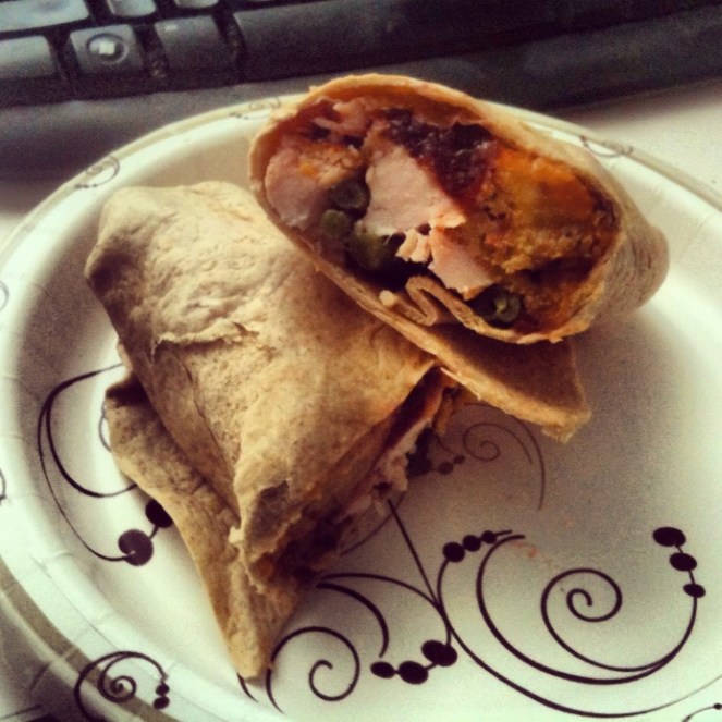 This is today’s lunch: Turducken (albeit mostly turkey) on a whole-wheat wrap with stuffing, mashed sweet potatoes, string beans and the jalapeno-cranberry chutney.