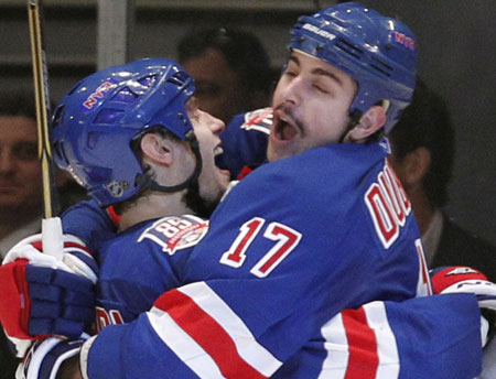In honor of the Rangers’ playoff appearance, Katz’s Deli has unveiled the Rangers Hat Trick. It is pastrami, corned beef and brisket on rye, apparently with mustard. It looks like this: