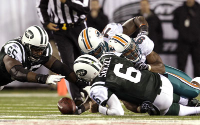 But it’s an accomplishment for the defense to hold an NFL team to 10 points, even in crappy conditions, when the team is given good field position again and again. And tons of credit should go to Dolphins punter Brandon Fields. How many times the Jets wind up just outside field-goal range on fourth down? If Fields didn’t average 56.4 yards on 10 punts, the Jets probably would have been able to scrap their way to a victory despite the lack of offense.
