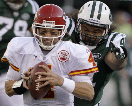 But that’s a good thing, isn’t it? The Chiefs looked terrible, but it would have been eminently Jets-ish for the Jets to win or lose a thriller with Tyler Palko suddenly looking like late-period Joe Montana. Instead, he looked like Sackbait McGillicuddy, enough so that by early in the second half when the bartender switched to the far more compelling Redskins-Patriots affair, Palko was the sympathetic embodiment of an awful one-sided football mess. Been there.