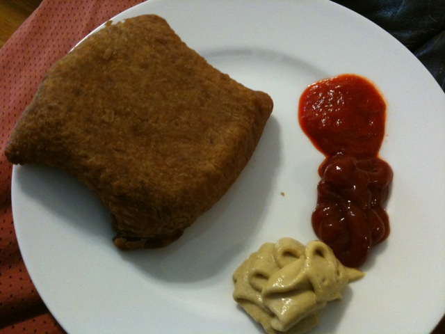 As you can see, I served myself my knish with mustard, ketchup and sriracha. It turned out sriracha was no good on a knish, so just pretend that’s not there. Mustard is the traditional knish condiment. I don’t want to get into another whole debate, but I like a little ketchup on there too, for sweetness. Mostly mustard, though.