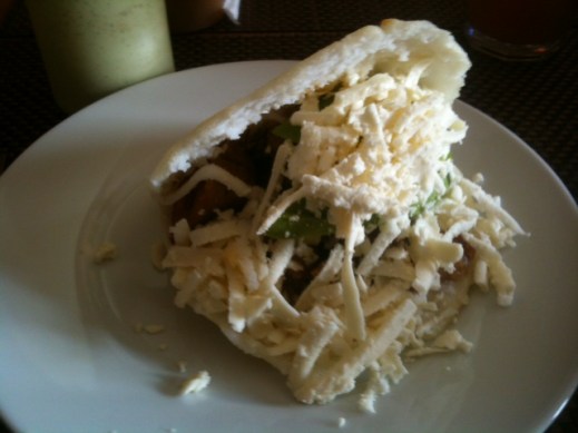Arguments against: It’s called an arepa, not a sandwich. Ho hum. There’s only one bread-thing (the arepa), it is made from cornmeal, and it’s sort of a pancake/muffin hybrid, and not very bready.