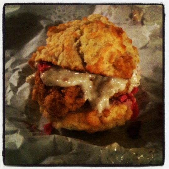 The construction: Fried chicken with red cabbage slaw and white gravy on a buttermilk biscuit.