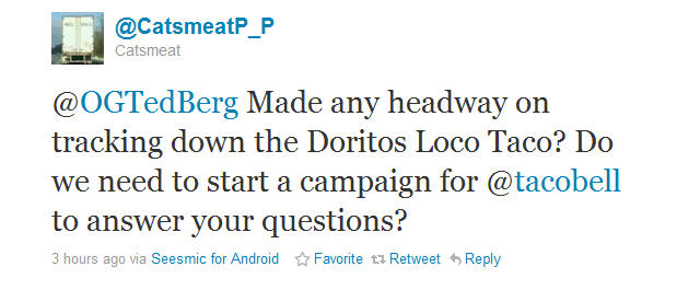 There were a few questions about the Doritos Loco Taco, which is, of course, the Taco Bell taco made with a Nacho-Cheese Doritos shell. I haven’t had one yet. I have heard rumors that they’re available at the Taco Bell on 14th and 5th here in Manhattan, but no one has confirmed this for me. Can anyone? Anyone live down there want to walk over and check it out? I don’t want to waste a subway ride if they don’t have ’em. Can you, like, call a Taco Bell and ask for the menu? Do Taco Bells even have phones?
