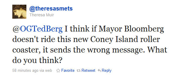 I agree wholeheartedly. If Bloomberg doesn’t ride the new roller coasters, it says: “I am a resident of the five boroughs that is not interested in checking out all my local roller-coaster options, so I am sort of lame.” And, without delving too deeply into politics, that’s just not a message I think I’d want to send if I were ever mayor.